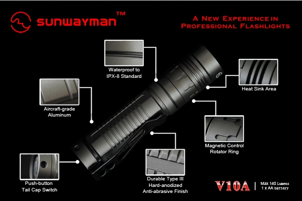 Good quality, high technique, great performance and intuitive user interface are standards to make up a good flahlight --- V10A. Utilizing SUNWAYMAN¡¯s signature Magnetic Control System (MCS) in combination with our new fully variable output circuit, users can select any brightness desired from 1 to 140 lumens.