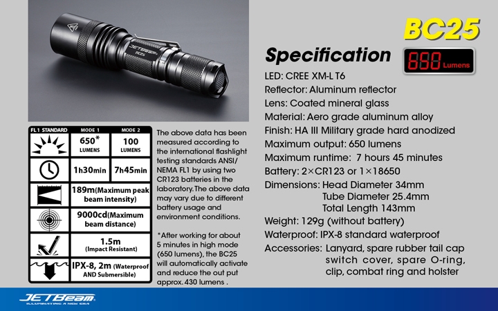 • Powered by 2*CR123 or 1*18650 batteries