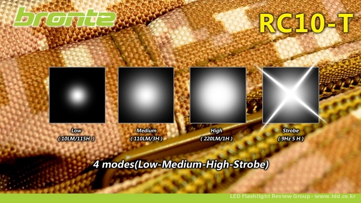 The outdoor flashlight Bronte RC10-T is the updated version of Bronte RC10.Flashlight RC10-T with Max output 220 lumens is outstandingly bright for its size class. Bronte RC10-T has a solid black hard anodized finish, which prevents scratches and wears on the aluminum body.With the compact and smart design,it is portable and comfortable to hold.It will surely meet your various illumination needs and bring you much convenience.The exquisite and powerful Bronte RC10-T will be your best choice for hiking, camping, riding,everyday carry and other outdoor activities.