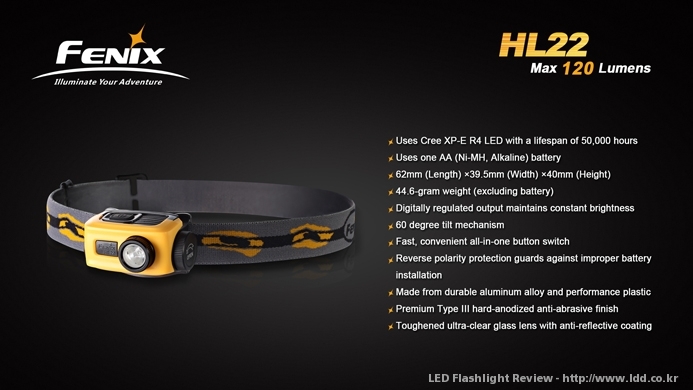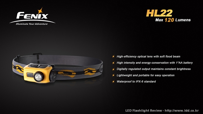 The Fenix HL22 Headlamp offers three useful brightness levels with 120-lumen max output and up to 55hr runtime from a single AA battery. A 90m carry distance and IPX-6 waterproof certification mean the durable, easy-switching HL22 performs in a wide range of conditions.